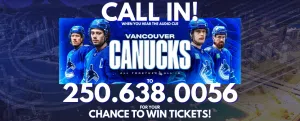 Every weekday listen to CFNR for the Canucks Shootout CUE TO CALL! When you hear it at 8:20AM and 4:20PM, call the studio at 250-638-0056 Caller #3 will have the chance to play in the Canucks Shootout! BE the Canucks, and choose who you shoot out against, make the shot and you're entered into the weekly draw for TWO ti...