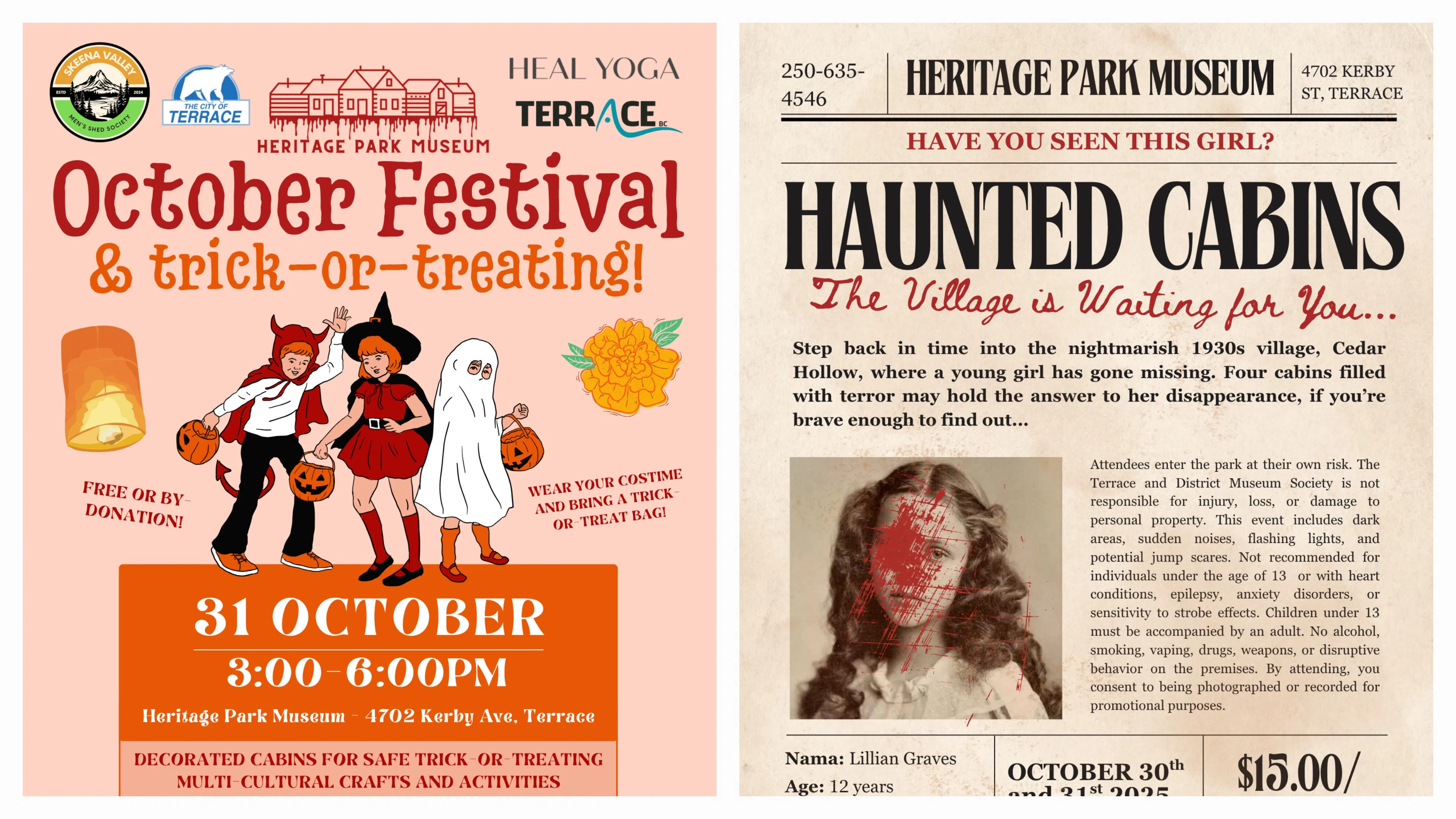 Heritage Park Museum in Terrace invites the community to its annual Haunted Cabins event on October 30th and 31st. Visitors will be transported to Cedar Hollow, a terrifying 1930s village where a young girl has mysteriously disappeared. Guests brave enough to explore four haunted cabins might uncover clues to her fate. The experience runs nightly from 8 to 9:30 p.m., with the final entry at 9:15 p.m. Tickets are on sale at Misty River Books, with a limited number available at the door. Note that tickets are date-specific and non-transferable.