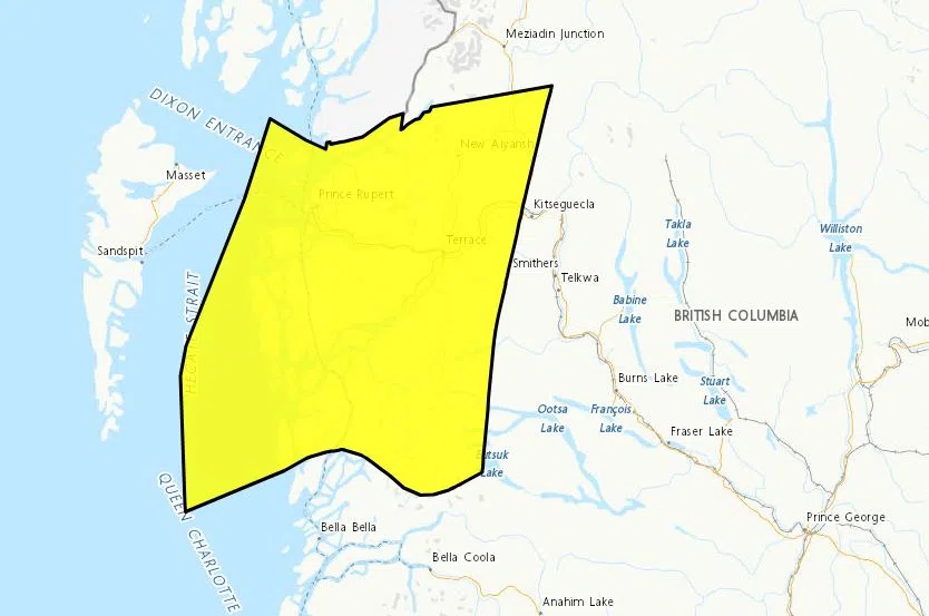 Meanwhile, along the North Coast coastline, including Prince Rupert, rainfall totals could reach up to 100 millimetres by this evening.
