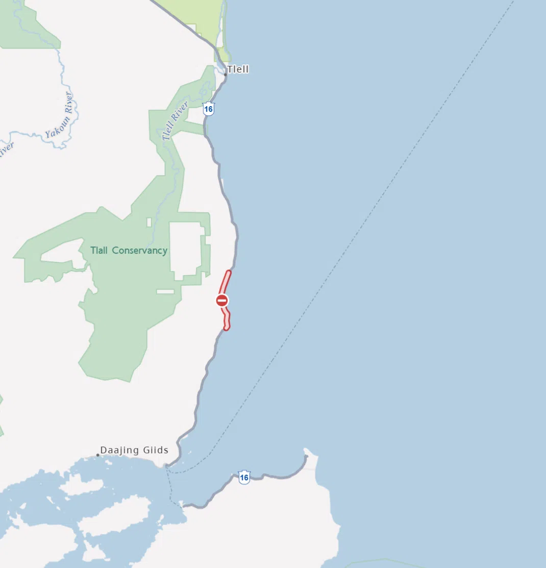Update on: single lane of traffic restored on Highway 16 between Tlell and Skidegate