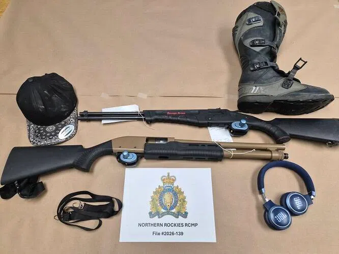 Nathan Jordan Jan 21, 2026 Photo of items recovered by the Northern Rockies RCMP following shots fired in Fort Nelson First Nation on Sunday, January 18th // Courtesy: Northern Rockies RCMP