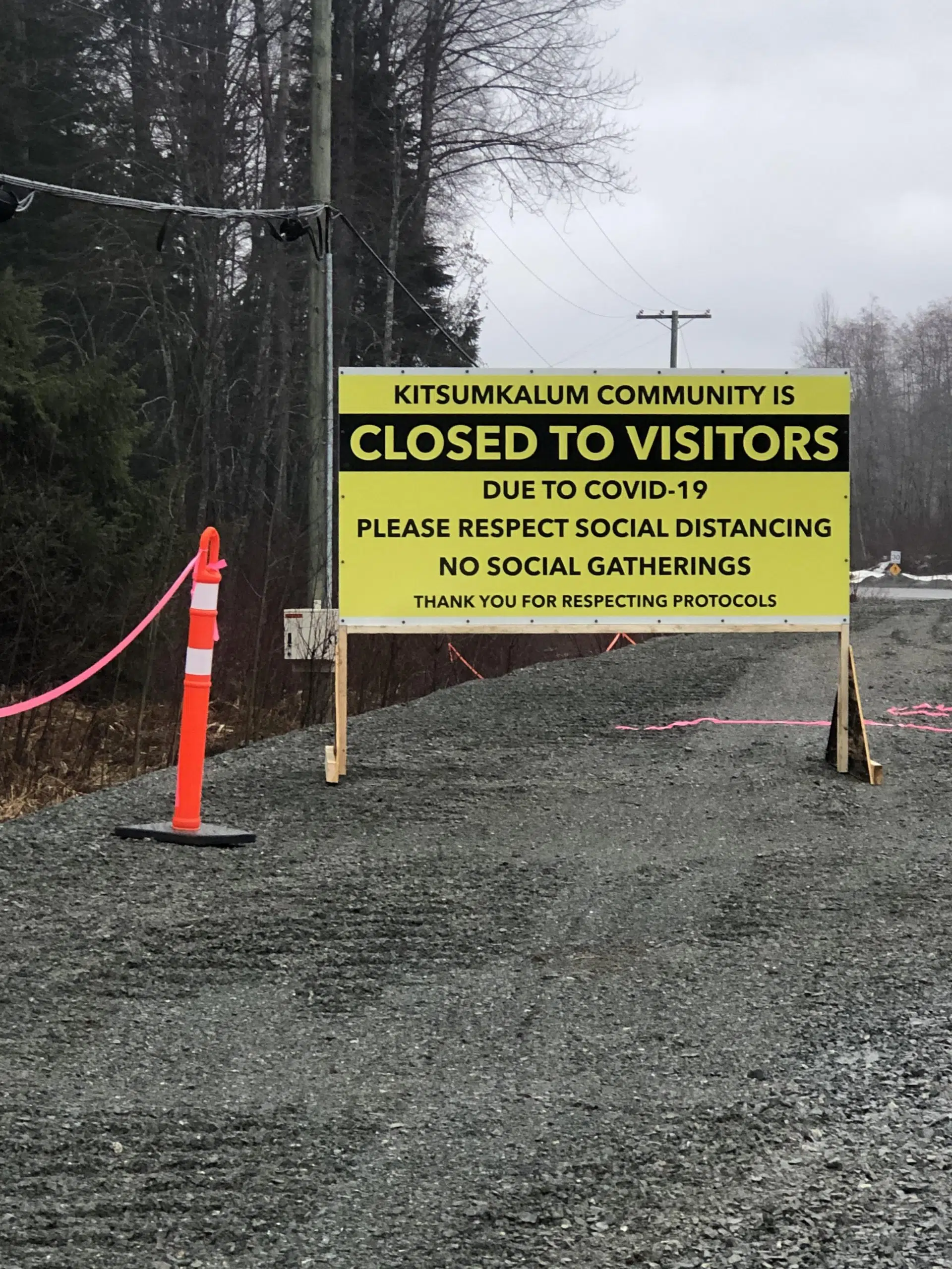 A sign is posted in Kitsumkalum. The sign says that the First Nation is closed at this time to visitors due to Covid-19. This is due to the increasing protocol around reduced social gatherings and phy...
