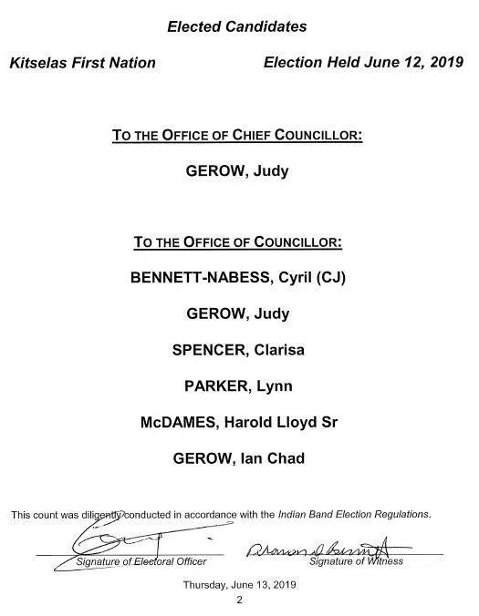 Judy Gerow is the new Chief Councillor for the Kitselas First Nation Band Council following yesterday's election. Gerow took home 66 of 201 ballots cast, narrowly beating out runner up Glenn Bennett. ...