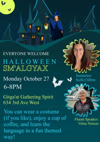 The evening will feature fun and interactive language activities with a Halloween twist, offering a creative and culturally rich way to support the revitalization of Sm’algyax in the community.